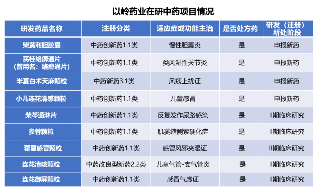专利中药方面,数据显示,以岭药业近五年有连花清咳片、通络明目胶囊、解郁除烦胶囊、益肾养心安神片、芪防鼻通片5个新药陆续获批。在研品种中,3个1.1类中药创新药柴黄利胆胶囊、芪桂络痹通片、小儿连花清感颗粒和1个3.1类中药新药已申报新药,5个中药创新药处于Ⅱ期临床研究阶段。