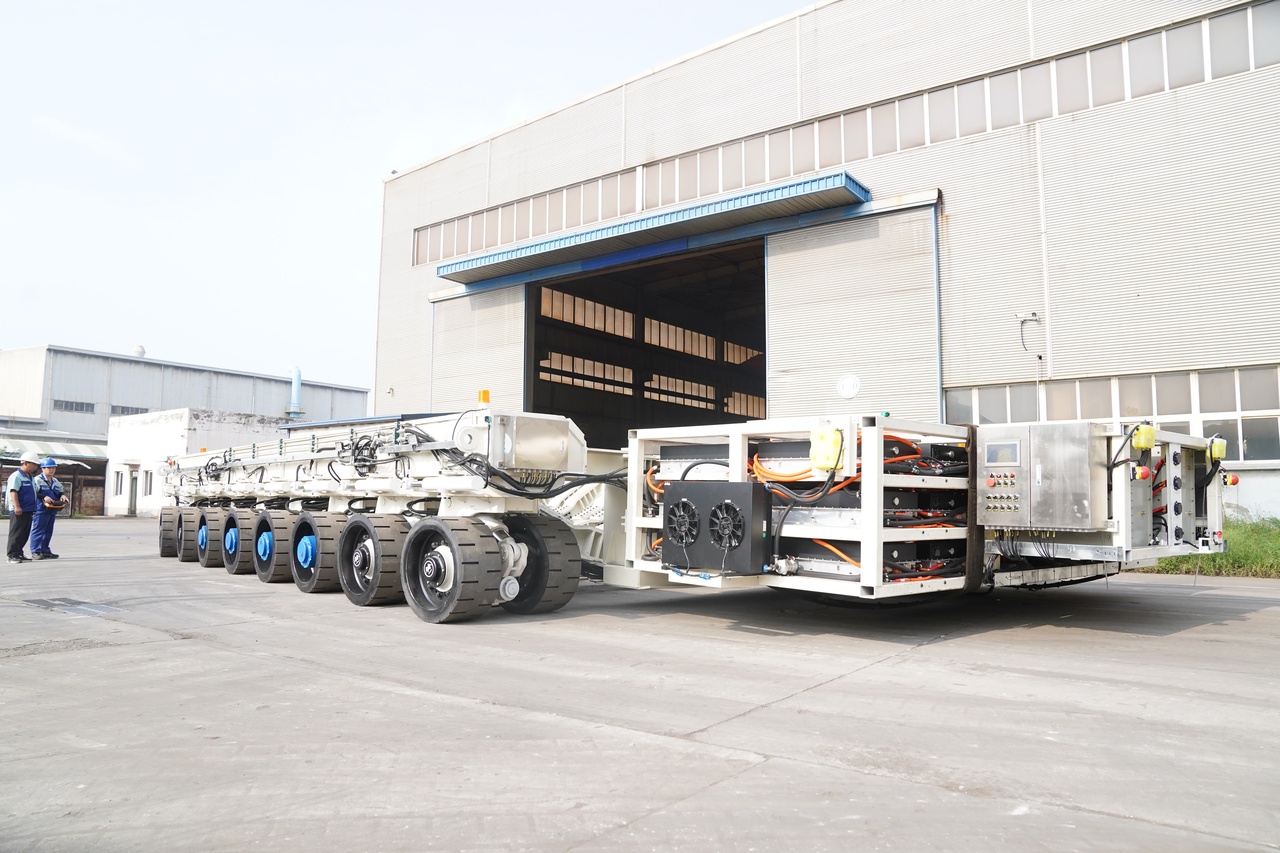 该设备采用模块化设计,使生产、运输、组装及拆解效率提高30%以上。在结构设计方面,成功克服了载重大、作业空间有限和坡度陡等诸多挑战,并引入新能源与智能化技术——以锂电池动力系统替代传统柴油动力,有效解决隧道内尾气排放问题,同时降低噪音30分贝以上。此外,设备还配备自动测距等智能监控系统,可确保盾构机在隧道内运输过程中始终保持安全稳定运行。